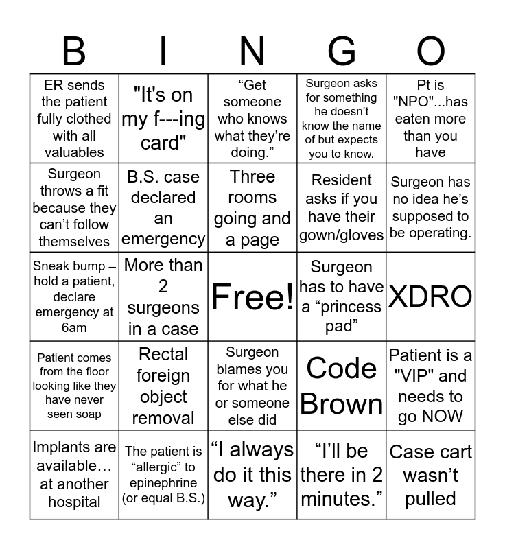 This bingo card has a free space and 50 words: Sleeve of shame, Case cart wasn’t pulled, Surgeon has never met the patient, “I always do it this way.”, Rectal foreign object removal, Got kicked out of a room, "It's on my f---ing card", “Emergency” Lap chole, Surgeon throws a fit because they can’t follow themselves, Someone passes out, B.S. case declared an emergency, Surgeon asks for something he doesn’t know the name of but expects you to know., Patient is a "VIP" and needs to go NOW, Code Brown, Medical student and/or resident contaminates something, Music is too loud, can’t hear the surgeon, Three rooms going and a page, Surgeon has to have a “princess pad”, “Emergency” Knee scope, Pt is "NPO"...has eaten more than you have, More than 2 surgeons in a case, “I’ll be there in 2 minutes.”, ER sends the patient fully clothed with all valuables, Resident asks if you have their gown/gloves, Musical chair surgeons, Surgeon has a power trip or diva moment, Surgeon has no idea he’s supposed to be operating., Dropped an essential item and it has to be flashed, “Get someone who knows what they’re doing.”, Surgeon blames you for what he or someone else did, Patient is “Alert and Oriented.” Doesn’t know which body part is being operated on., Case was scheduled wrong, “This is going to take 5 minutes.”, Get yelled at by a surgeon, The patient is “allergic” to epinephrine (or equal B.S.), Patient denies belongings and/or jewelry; the truth comes out after the blankets come off, Surgeon is hiding the missing sponge, “I need big men.”, “It’s on backorder”, XDRO, TB, Turnover time + language line = surgeon frustration, “I hate operating on the weekends” The feeling is mutual, We have to provide our own meatballs (Scrub + 1), Implants are available…at another hospital, Sneak bump – hold a patient, declare emergency at 6am, Free Parking – Putting a case on the schedule “Just in case”, Surgeon refuses to speak to another surgeon, Patient comes from the floor looking like they have never seen soap and Attacked by farm animal.