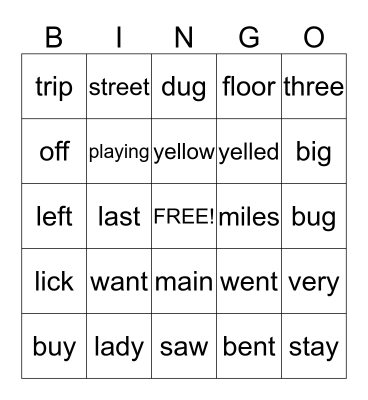 This bingo card has a free space and 24 words: want, lady, yellow, buy, three, trip, off, street, miles, main, yelled, left, went, very, playing, bent, bug, dug, big, last, stay, lick, floor and saw.