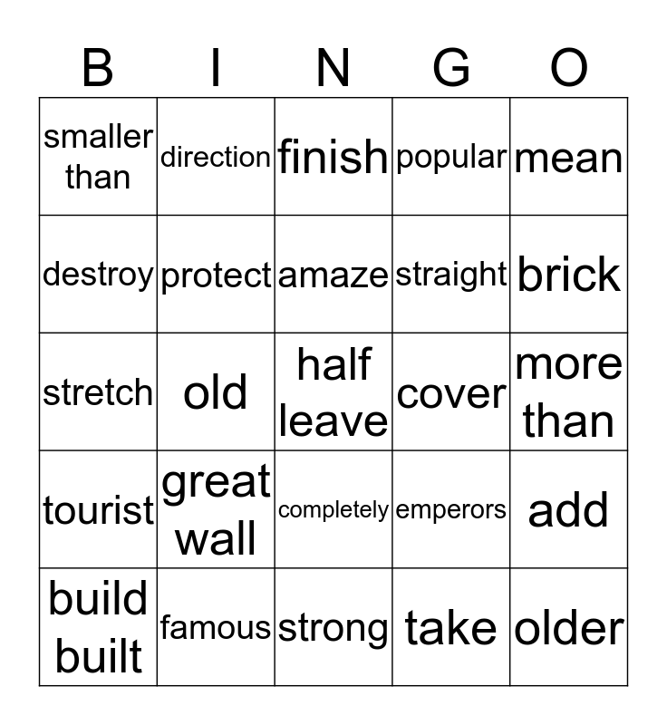 This bingo card has a free space and 24 words: great wall, famous, amaze, build built, mean, smaller than, destroy, direction, cover, completely, straight, stretch, emperors, add, protect, take, more than, finish, brick, old, older, tourist, popular and strong.