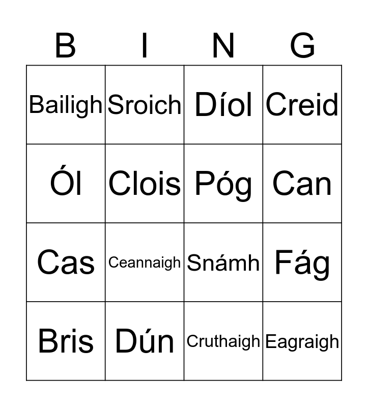 This bingo card has 16 words: Dún, Fág, Díol, Bailigh, Cas, Sroich, Snámh, Cruthaigh, Ól, Clois, Bris, Creid, Ceannaigh, Can, Póg and Eagraigh.