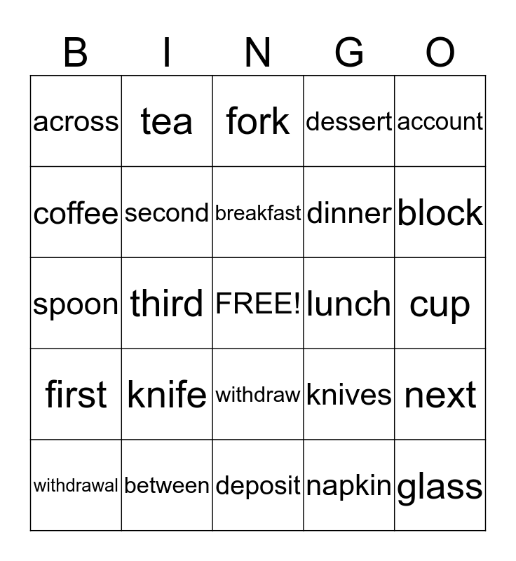 This bingo card has a free space and 24 words: knife, between, breakfast, withdrawal, account, across, coffee, tea, lunch, withdraw, dinner, spoon, knives, next, second, napkin, cup, fork, block, third, glass, first, dessert and deposit.