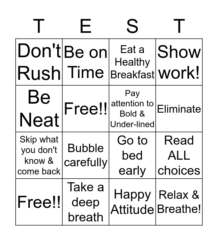 This bingo card has 16 words: Take a deep breath, Read ALL choices, Eat a Healthy Breakfast, Don't Rush, Skip what you don't know & come back, Be on Time, Go to bed early, Happy Attitude, Be Neat, Free!!, Free!!, Show work!, Bubble carefully, Eliminate, Pay attention to Bold & Under-lined and Relax & Breathe!.
