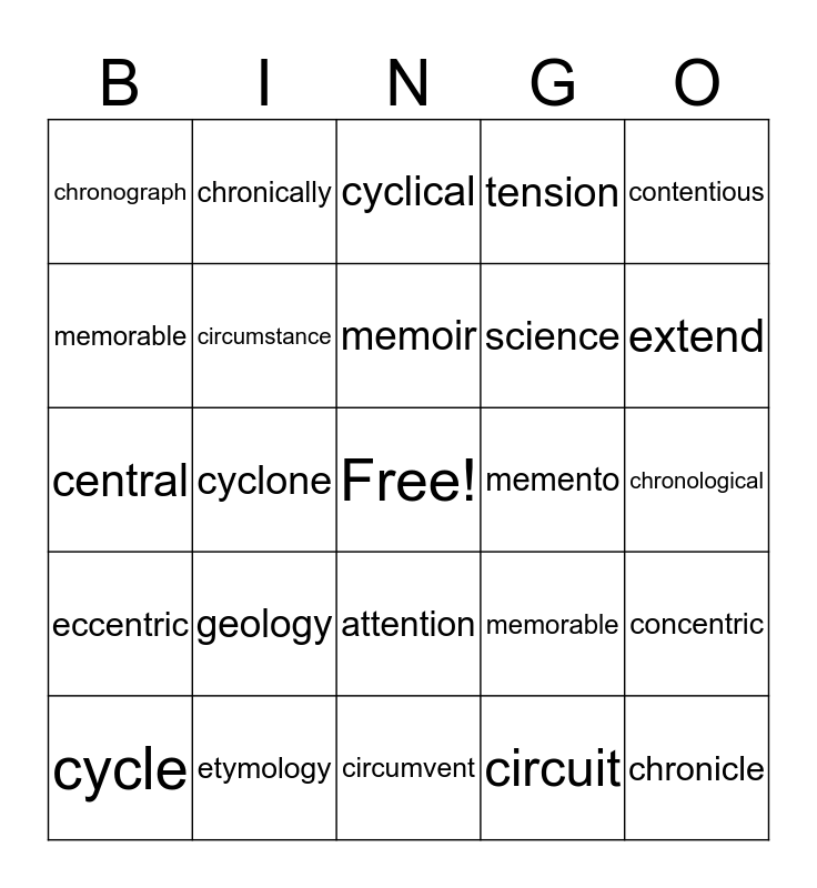 This bingo card has a free space and 24 words: geology, etymology, memoir, cycle, contentious, chronograph, memorable, chronically, memento, attention, science, central, memorable, concentric, circumstance, circuit, chronological, cyclical, extend, cyclone, chronicle, eccentric, tension and circumvent.
