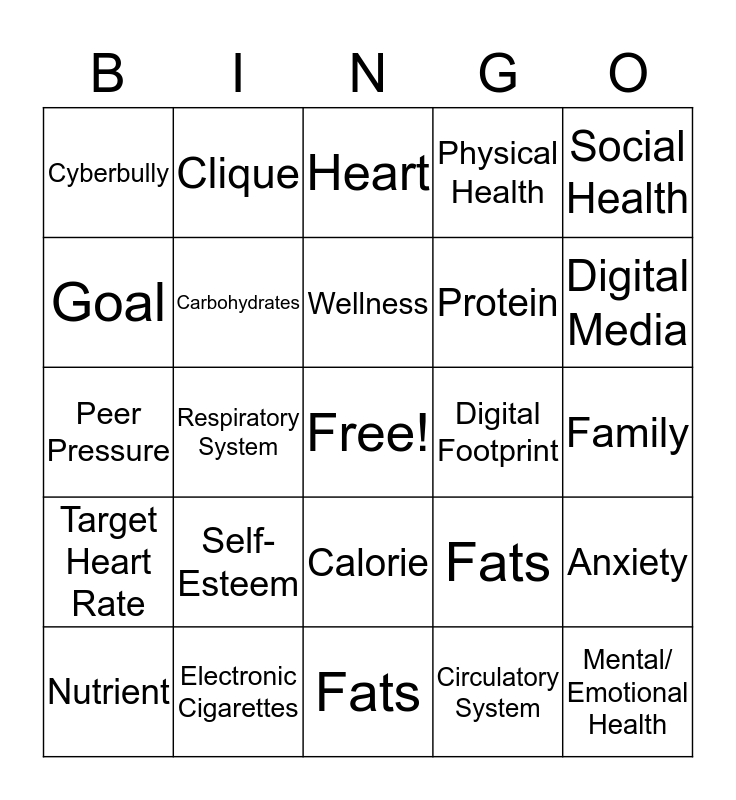 This bingo card has a free space and 24 words: Self- Esteem, Electronic Cigarettes, Wellness, Nutrient, Social Health, Cyberbully, Goal, Clique, Digital Footprint, Calorie, Protein, Peer Pressure, Fats, Anxiety, Carbohydrates, Circulatory System, Family, Heart, Digital Media, Respiratory System, Mental/ Emotional Health, Target Heart Rate, Physical Health and Fats.