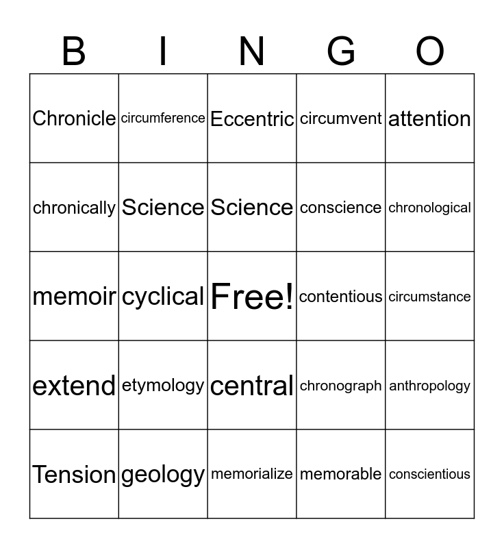 This bingo card has a free space and 24 words: etymology, geology, Science, Tension, attention, Chronicle, chronically, circumference, contentious, central, conscience, memoir, chronograph, anthropology, Science, memorable, circumstance, Eccentric, chronological, cyclical, conscientious, extend, circumvent and memorialize.