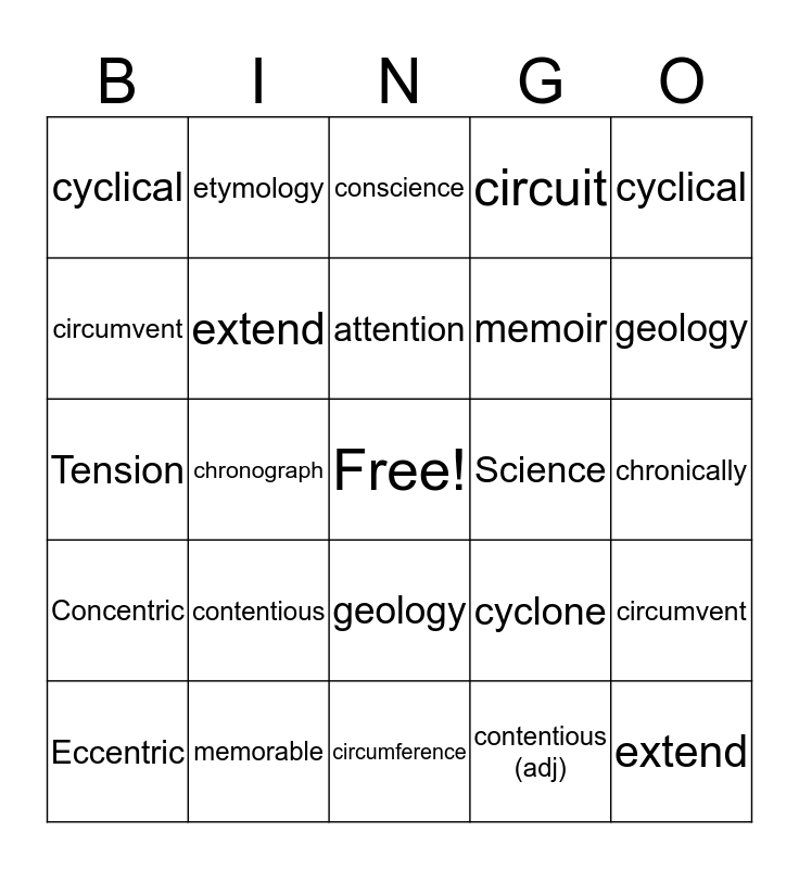 This bingo card has a free space and 24 words: contentious, memorable, attention, Eccentric, cyclical, cyclical, circumvent, etymology, Science, geology, memoir, Tension, cyclone, circumvent, extend, contentious (adj), chronically, conscience, geology, chronograph, extend, Concentric, circuit and circumference.