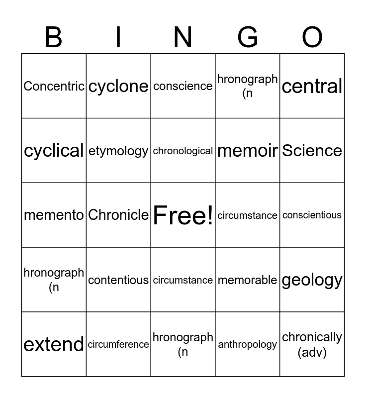 This bingo card has a free space and 24 words: contentious, circumference, chronological, extend, central, Concentric, cyclical, cyclone, circumstance, circumstance, memoir, memento, memorable, geology, etymology, anthropology, conscientious, conscience, Science, Chronicle, chronically (adv), hronograph (n, hronograph (n and hronograph (n.