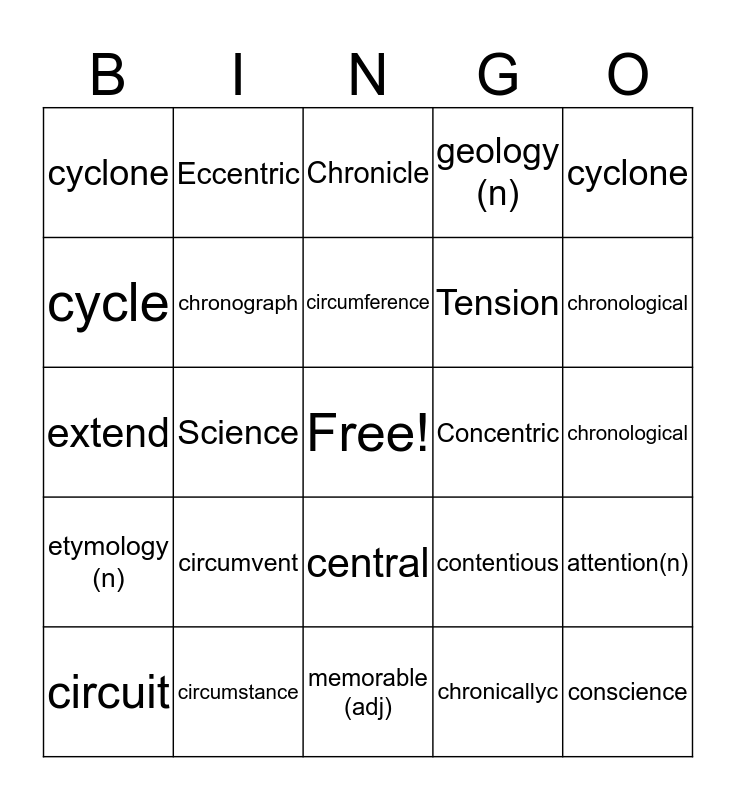 This bingo card has a free space and 24 words: circumvent, circumstance, circumference, circuit, cyclone, cyclone, cycle, Eccentric, Concentric, central, Tension, extend, contentious, attention(n), chronograph, chronicallyc, chronological, Chronicle, chronological, Science, conscience, etymology (n), geology (n) and memorable (adj).