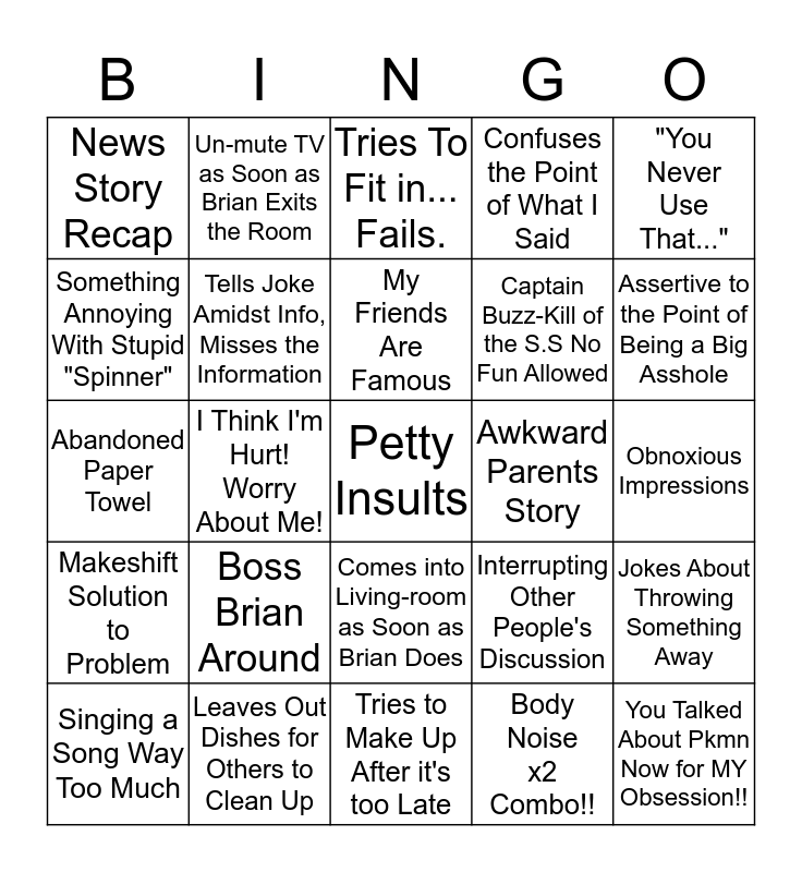 This bingo card has a free space and 24 words: Boss Brian Around, Leaves Out Dishes for Others to Clean Up, My Friends Are Famous, Singing a Song Way Too Much, "You Never Use That...", News Story Recap, Something Annoying With Stupid "Spinner", Un-mute TV as Soon as Brian Exits the Room, Awkward Parents Story, Comes into Living-room as Soon as Brian Does, Captain Buzz-Kill of the S.S No Fun Allowed, Abandoned Paper Towel, Interrupting Other People's Discussion, Jokes About Throwing Something Away, Tells Joke Amidst Info, Misses the Information, Body Noise x2 Combo!!, Obnoxious Impressions, Tries To Fit in... Fails., Assertive to the Point of Being a Big Asshole, I Think I'm Hurt! Worry About Me!, You Talked About Pkmn Now for MY Obsession!!, Makeshift Solution to Problem, Confuses the Point of What I Said and Tries to Make Up After it's too Late.