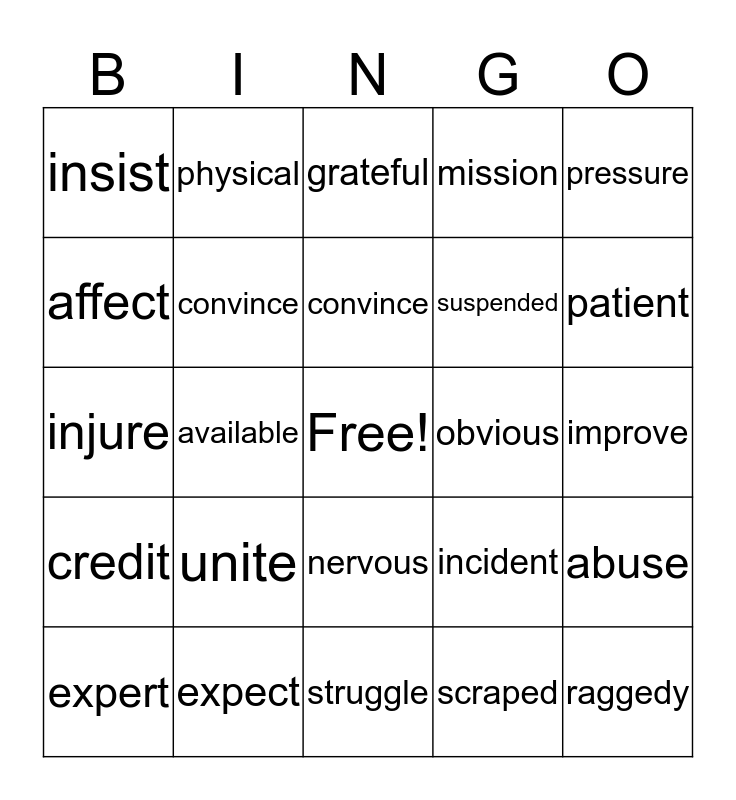 This bingo card has a free space and 25 words: unite, struggle, convince, expert, pressure, insist, affect, physical, obvious, nervous, suspended, injure, incident, abuse, convince, privilege, improve, grateful, patient, available, raggedy, expect, credit, mission and scraped.