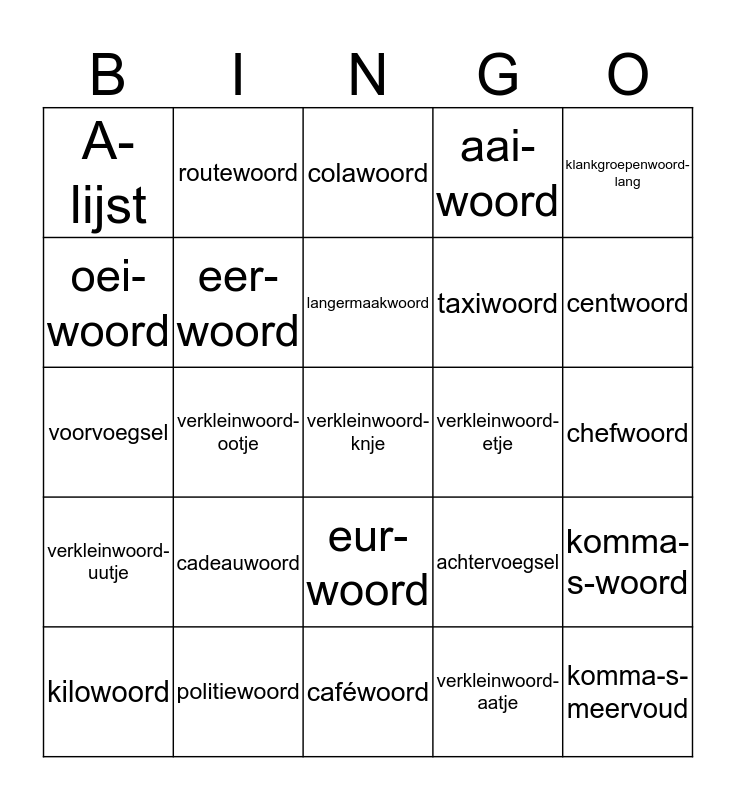 This bingo card has 35 words: zingwoord, luchtwoord, plankwoord, eer-woord, eur-woord, aai-woord, oei-woord, ooi-woord, langermaakwoord, langermaakwoord-b, voorvoegsel, klankgroepenwoord-lang, Free!, klankgroepenwoord-kort, A-lijst, verkleinwoord-etje, verkleinwoord-aatje, verkleinwoord-ootje, verkleinwoord-uutje, verkleinwoord-knje, achtervoegsel, kilowoord, komma-s-woord, politiewoord, colawoord, centwoord, komma-s-meervoud, tropisch-woord, taxiwoord, chefwoord, theewoord, caféwoord, cadeauwoord, routewoord and garagewoord.