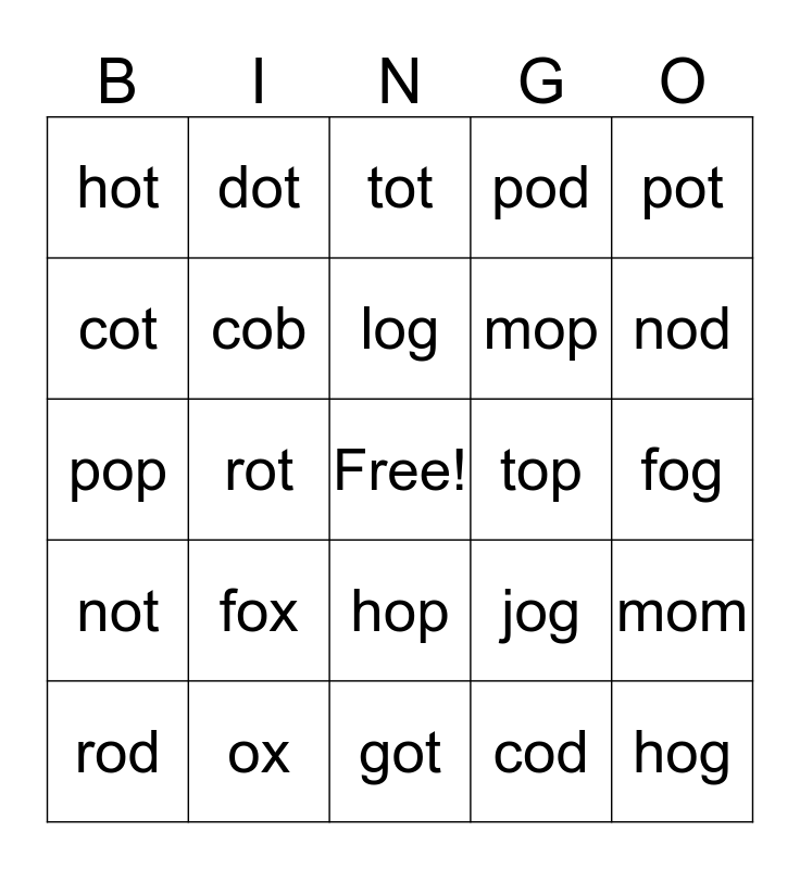 This bingo card has a free space and 24 words: fox, ox, log, rod, pot, hot, cot, dot, top, hop, mop, pop, jog, mom, cob, cod, fog, tot, nod, rot, hog, not, pod and got.