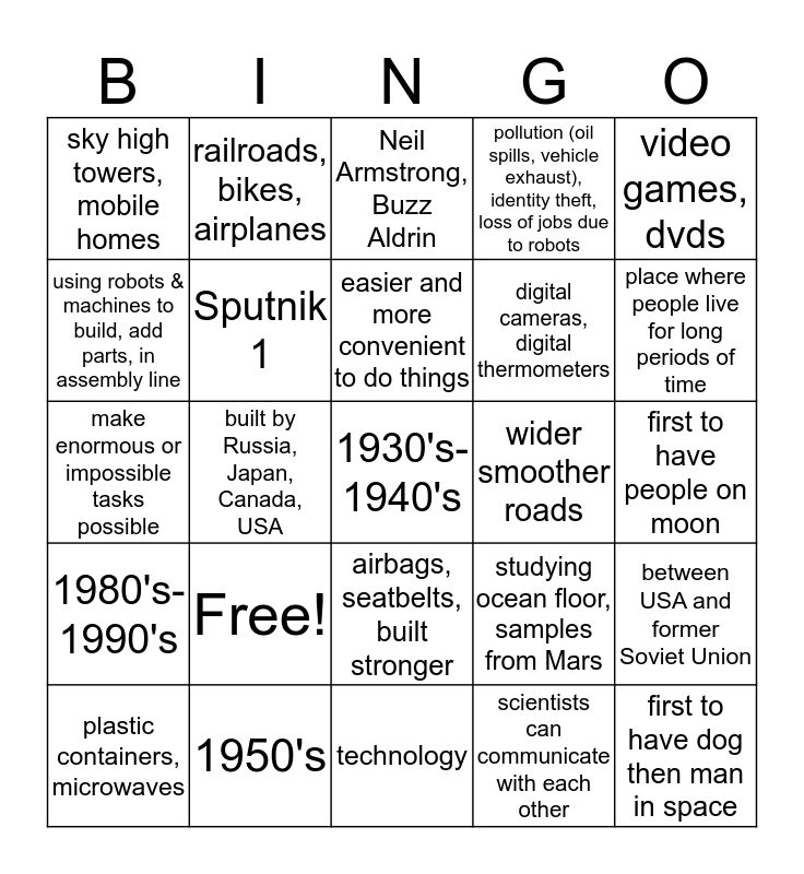 This bingo card has 25 words: Free!, technology, easier and more convenient to do things, plastic containers, microwaves, video games, dvds, sky high towers, mobile homes, using robots & machines to build, add parts, in assembly line, railroads, bikes, airplanes, wider smoother roads, airbags, seatbelts, built stronger, digital cameras, digital thermometers, make enormous or impossible tasks possible, studying ocean floor, samples from Mars, between USA and former Soviet Union, Sputnik 1, first to have dog then man in space, first to have people on moon, Neil Armstrong, Buzz Aldrin, place where people live for long periods of time, built by Russia, Japan, Canada, USA, 1930's-1940's, 1950's, 1980's-1990's, pollution (oil spills, vehicle exhaust), identity theft, loss of jobs due to robots and scientists can communicate with each other.