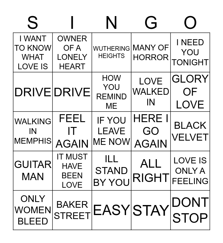 This bingo card has 25 words: IT MUST HAVE BEEN LOVE, EASY, HOW YOU REMIND ME, ONLY WOMEN BLEED, I NEED YOU TONIGHT, I WANT TO KNOW WHAT LOVE IS, DRIVE, OWNER OF A LONELY HEART, HERE I GO AGAIN, ILL STAND BY YOU, LOVE WALKED IN, WALKING IN MEMPHIS, ALL RIGHT, LOVE IS ONLY A FEELING, DRIVE, DONT STOP, BLACK VELVET, WUTHERING HEIGHTS, GLORY OF LOVE, FEEL IT AGAIN, IF YOU LEAVE ME NOW, BAKER STREET, GUITAR MAN, MANY OF HORROR and STAY.