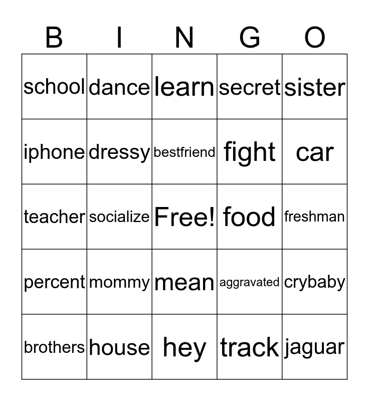 This bingo card has a free space and 24 words: mommy, house, bestfriend, brothers, sister, school, iphone, dance, food, mean, fight, teacher, aggravated, crybaby, dressy, track, freshman, learn, car, socialize, jaguar, percent, secret and hey.