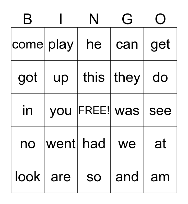 This bingo card has a free space and 24 words: went, are, this, look, get, come, got, play, was, had, they, in, we, at, up, and, see, he, do, you, am, no, can and so.