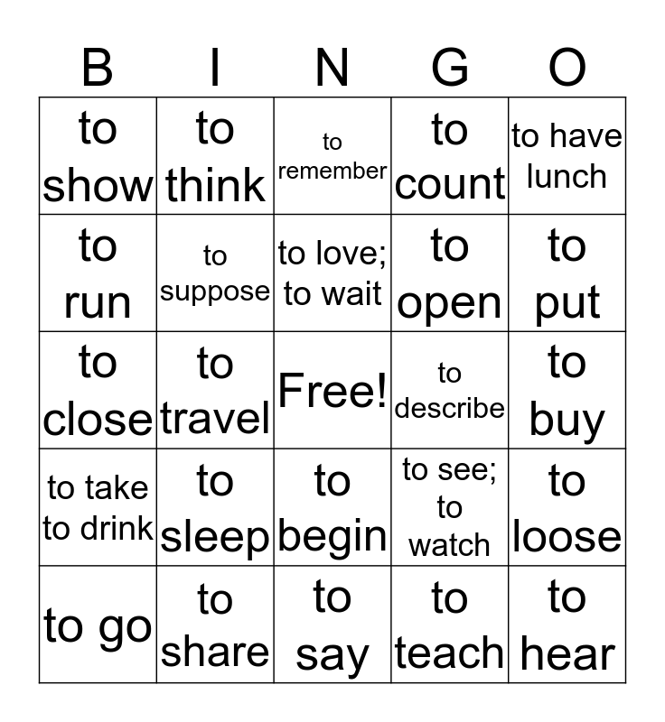 This bingo card has a free space and 24 words: to sleep, to share, to love; to wait, to go, to have lunch, to show, to run, to think, to describe, to begin, to open, to close, to see; to watch, to loose, to suppose, to teach, to buy, to remember, to put, to travel, to hear, to take to drink, to count and to say.
