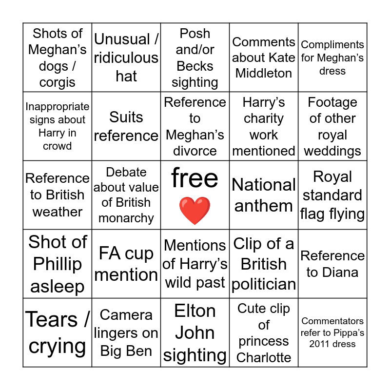 This bingo card has a free space and 24 words: FA cup mention, Camera lingers on Big Ben, Reference to Meghan’s divorce, Tears / crying, Compliments for Meghan’s dress, Shots of Meghan’s dogs / corgis, Inappropriate signs about Harry in crowd, Unusual / ridiculous hat, National anthem, Mentions of Harry’s wild past, Harry’s charity work mentioned, Reference to British weather, Clip of a British politician, Reference to Diana, Suits reference, Cute clip of princess Charlotte, Royal standard flag flying, Posh and/or Becks sighting, Footage of other royal weddings, Debate about value of British monarchy, Commentators refer to Pippa’s 2011 dress, Shot of Phillip asleep, Comments about Kate Middleton and Elton John sighting.