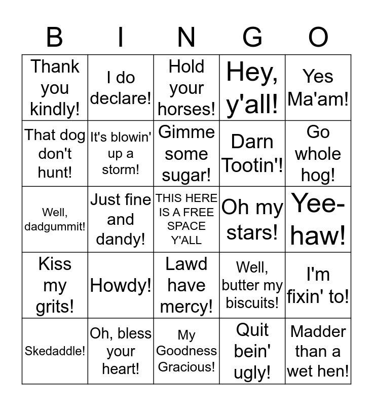 This bingo card has a free space and 24 words: Howdy!, Oh, bless your heart!, Gimme some sugar!, Skedaddle!, Yes Ma'am!, Thank you kindly!, That dog don't hunt!, I do declare!, Oh my stars!, Lawd have mercy!, Darn Tootin'!, Well, dadgummit!, Well, butter my biscuits!, I'm fixin' to!, It's blowin' up a storm!, Quit bein' ugly!, Yee-haw!, Hold your horses!, Go whole hog!, Just fine and dandy!, Madder than a wet hen!, Kiss my grits!, Hey, y'all! and My Goodness Gracious!.