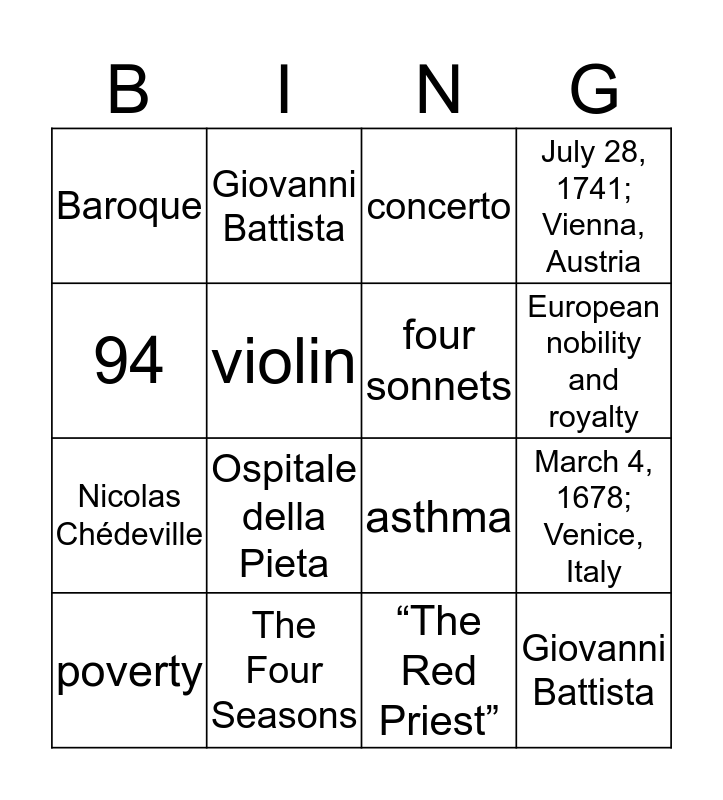 This bingo card has 16 words: The Four Seasons, March 4, 1678; Venice, Italy, concerto, Baroque, Nicolas Chédeville, Giovanni Battista, asthma, “The Red Priest”, 94, violin, poverty, July 28, 1741; Vienna, Austria, Ospitale della Pieta, European nobility and royalty, four sonnets and Giovanni Battista.