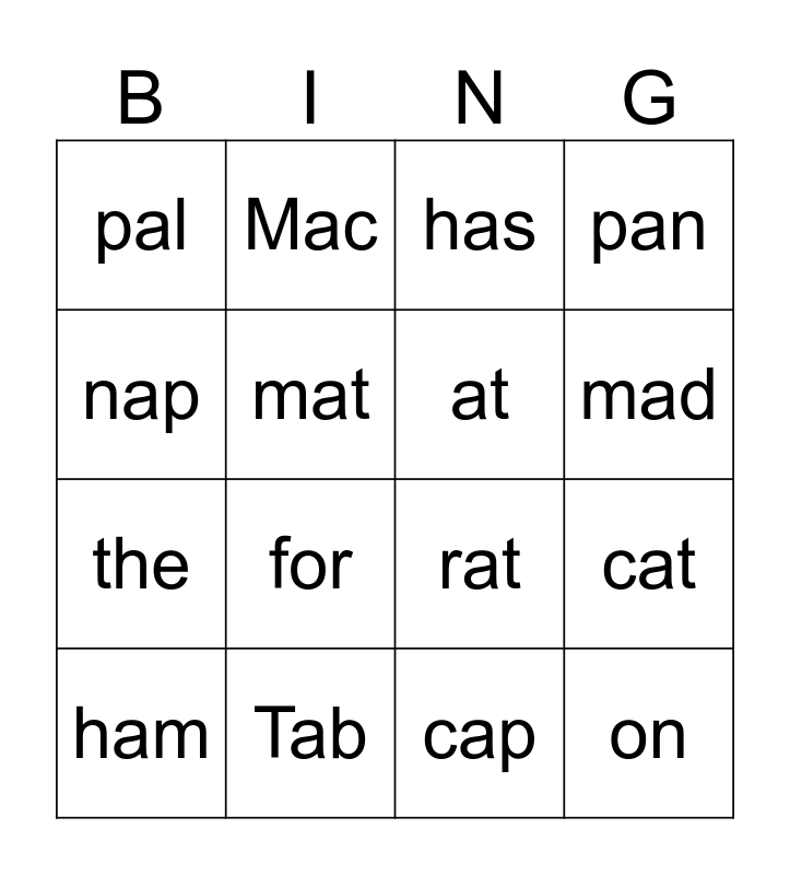 This bingo card has 16 words: Tab, cat, has, pal, the, Mac, rat, cap, nap, mat, ham, pan, for, mad, at and on.