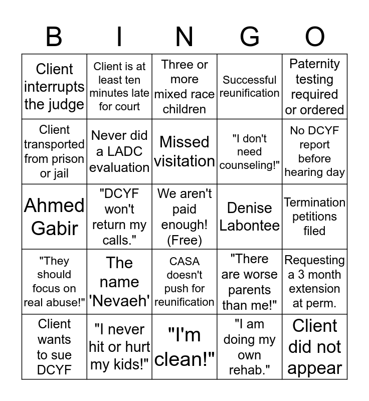 This bingo card has a free space and 24 words: The name 'Nevaeh', "I never hit or hurt my kids!", Missed visitation, Client wants to sue DCYF, Paternity testing required or ordered, Client interrupts the judge, Client transported from prison or jail, Client is at least ten minutes late for court, Denise Labontee, CASA doesn't push for reunification, "I don't need counseling!", Ahmed Gabir, "There are worse parents than me!", Requesting a 3 month extension at perm., Never did a LADC evaluation, "I am doing my own rehab.", Termination petitions filed, Three or more mixed race children, No DCYF report before hearing day, "DCYF won't return my calls.", Client did not appear, "They should focus on real abuse!", Successful reunification and "I'm clean!".