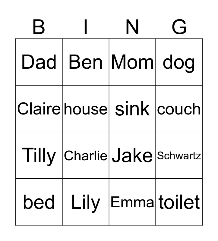 This bingo card has 16 words: Lily, Schwartz, Mom, Dad, Tilly, Ben, Jake, Emma, Claire, house, bed, dog, Charlie, couch, sink and toilet.