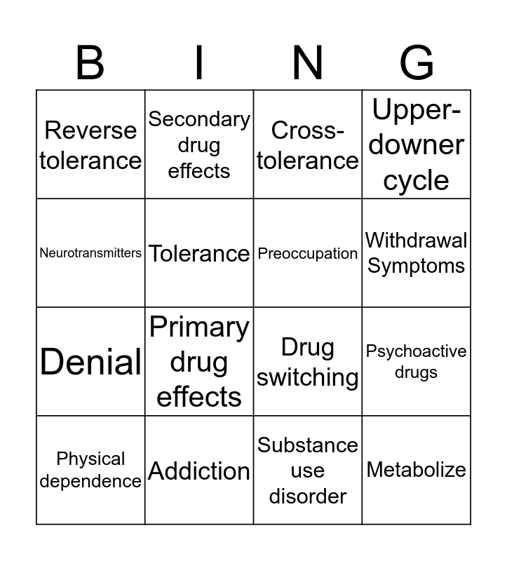 This bingo card has 16 words: Addiction, Psychoactive drugs, Cross-tolerance, Reverse tolerance, Denial, Secondary drug effects, Drug switching, Substance use disorder, Neurotransmitters, Tolerance, Physical dependence, Upper-downer cycle, Primary drug effects, Withdrawal Symptoms, Preoccupation and Metabolize.