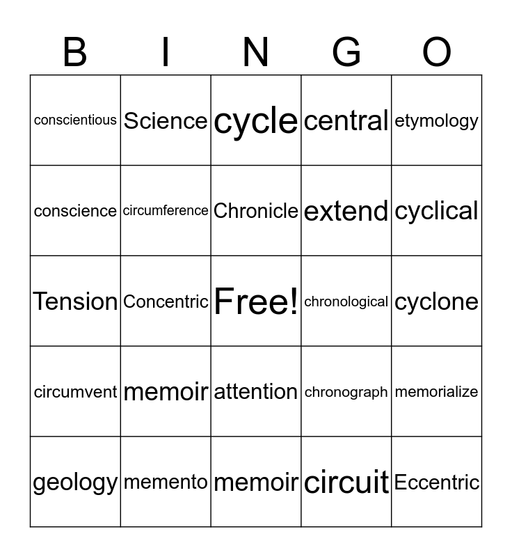 This bingo card has a free space and 24 words: memoir, memento, Chronicle, geology, etymology, conscientious, conscience, Science, chronological, attention, extend, Tension, chronograph, memorialize, circumference, circuit, cyclone, cycle, cyclical, Concentric, Eccentric, circumvent, central and memoir.