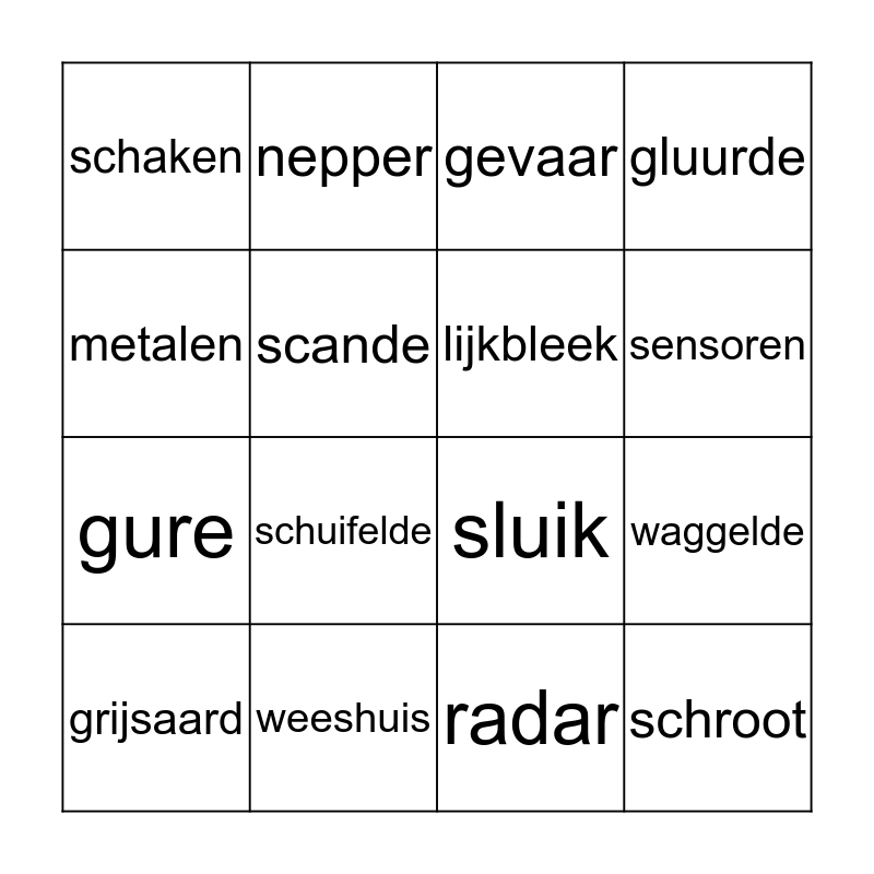 This bingo card has 16 words: weeshuis, waggelde, gevaar, schaken, gure, nepper, sluik, radar, metalen, scande, grijsaard, gluurde, schuifelde, sensoren, lijkbleek and schroot.