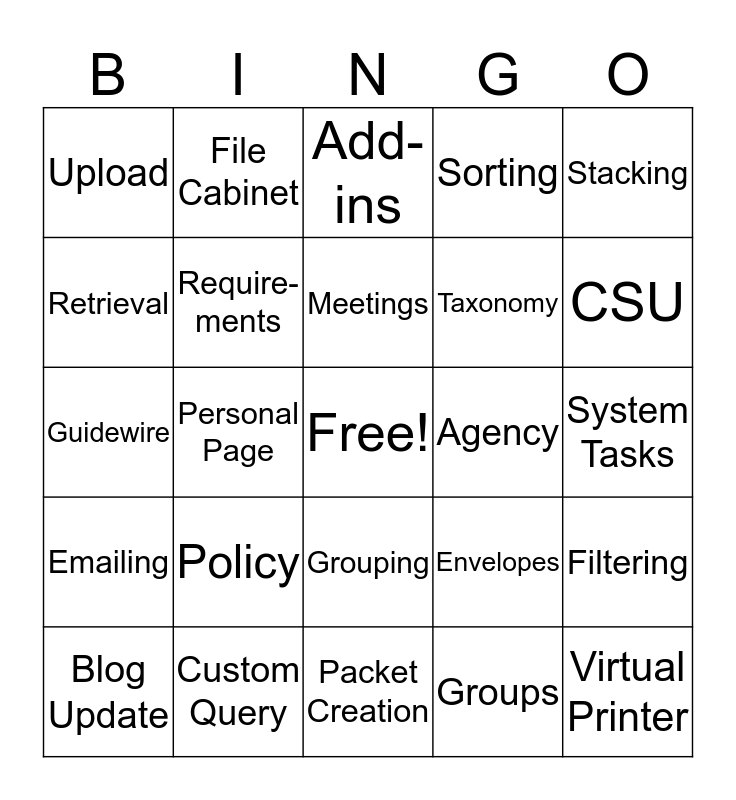 This bingo card has a free space and 24 words: Policy, Custom Query, Meetings, Blog Update, Stacking, Upload, Retrieval, File Cabinet, Agency, Grouping, Taxonomy, Guidewire, Envelopes, Filtering, Require-ments, Groups, System Tasks, Add-ins, CSU, Personal Page, Virtual Printer, Emailing, Sorting and Packet Creation.