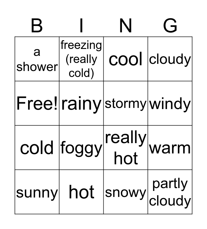 This bingo card has 16 words: hot, warm, cool, a shower, cold, freezing (really cold), really hot, snowy, Free!, rainy, sunny, cloudy, foggy, windy, stormy and partly cloudy.
