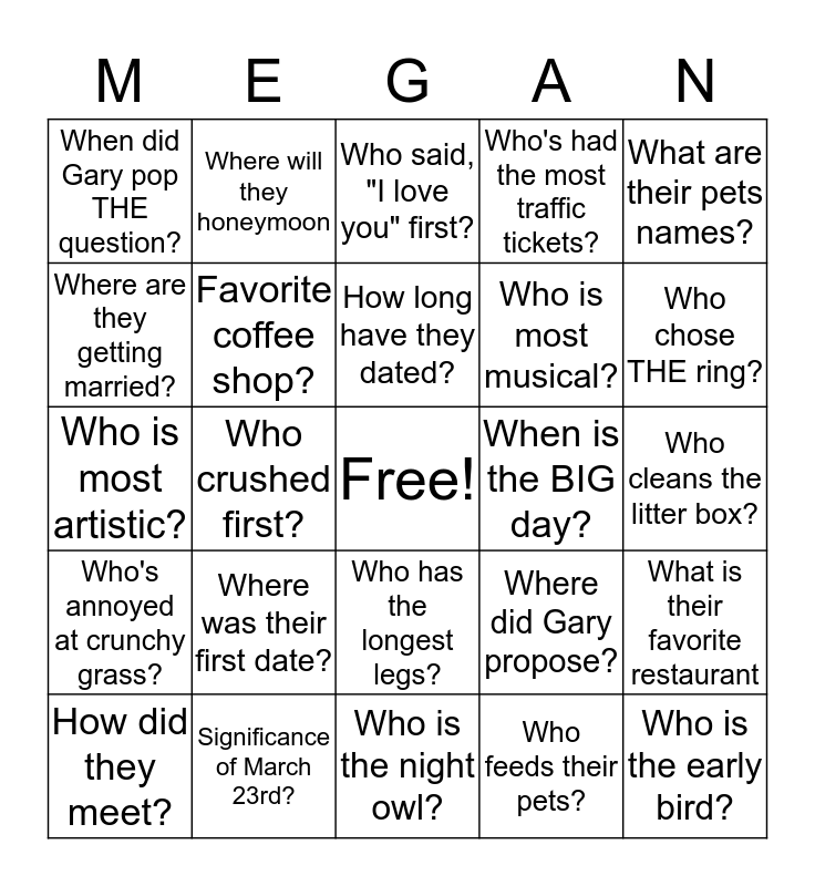 This bingo card has a free space and 24 words: Where was their first date?, Significance of March 23rd?, How long have they dated?, How did they meet?, What are their pets names?, When did Gary pop THE question?, Where are they getting married?, Where will they honeymoon, When is the BIG day?, Who has the longest legs?, Who is most musical?, Who is most artistic?, Where did Gary propose?, What is their favorite restaurant, Favorite coffee shop?, Who feeds their pets?, Who cleans the litter box?, Who said, "I love you" first?, Who chose THE ring?, Who crushed first?, Who is the early bird?, Who's annoyed at crunchy grass?, Who's had the most traffic tickets? and Who is the night owl?.