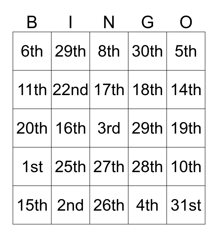 This bingo card has 25 words: 1st, 2nd, 3rd, 4th, 5th, 6th, 29th, 8th, 29th, 10th, 11th, 22nd, 26th, 28th, 14th, 15th, 16th, 17th, 18th, 19th, 20th, 25th, 27th, 30th and 31st.