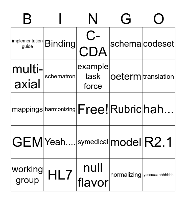 This bingo card has a free space and 24 words: Yeah...., HL7, example task force, working group, codeset, implementation guide, multi-axial, Binding, Rubric, symedical, oeterm, mappings, model, R2.1, schematron, normalizing, hah..., C-CDA, translation, harmonizing, yeaaaaahhhhhhh, GEM, schema and null flavor.