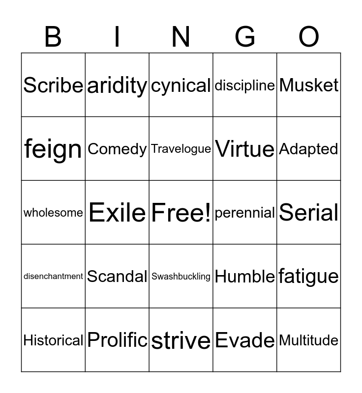 This bingo card has a free space and 27 words: Humble, Exercise, Virtue, strive, feign, cynical, aridity, disenchantment, perennial, fatigue, wholesome, discipline, Historical, Prolific, Adapted, Drama, Comedy, Travelogue, Scandal, Scribe, Serial, Evade, Exile, Multitude, Swashbuckling, Musket and Musketeer.