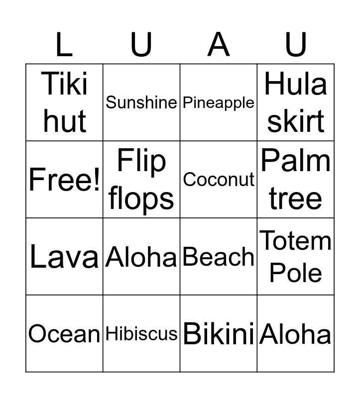 This bingo card has 17 words: Bikini, Ocean, Pineapple, Tiki hut, Aloha, Hula skirt, Totem Pole, Coconut, Palm tree, Flip flops, Hibiscus, Beach, Free!, Sunshine, Lava, Surfboard and Aloha.