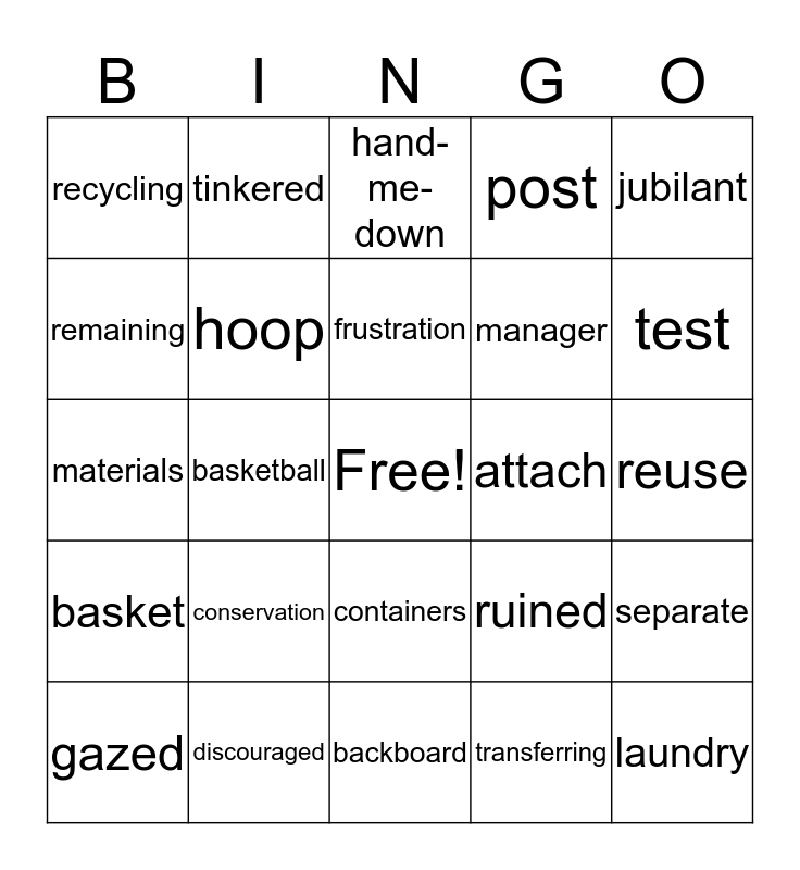 This bingo card has a free space and 24 words: conservation, discouraged, frustration, gazed, jubilant, recycling, remaining, tinkered, attach, containers, manager, materials, ruined, separate, hoop, transferring, reuse, hand-me-down, test, basketball, laundry, basket, post and backboard.