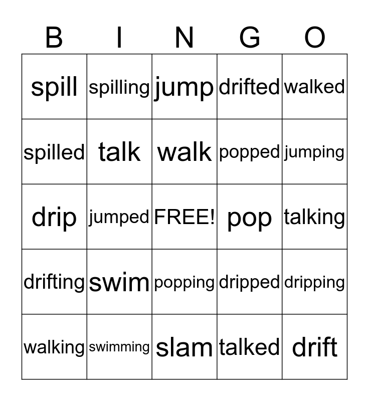 This bingo card has a free space and 24 words: swim, swimming, walk, walking, walked, spill, spilled, spilling, pop, popping, popped, drip, dripped, dripping, talk, talked, talking, jump, jumping, jumped, drift, drifting, drifted and slam.