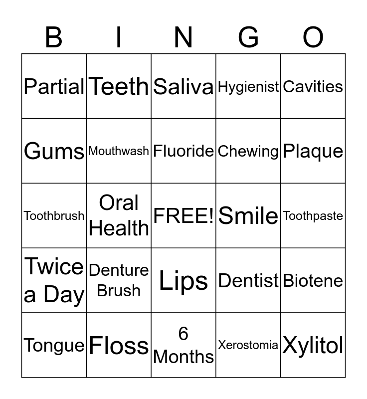 This bingo card has a free space and 24 words: Denture Brush, Floss, Fluoride, Tongue, Cavities, Partial, Gums, Teeth, Smile, Lips, Chewing, Toothbrush, Dentist, Biotene, Mouthwash, Xerostomia, Toothpaste, Saliva, Plaque, Oral Health, Xylitol, Twice a Day, Hygienist and 6 Months.