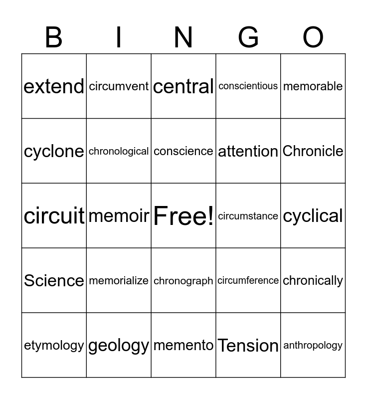 This bingo card has a free space and 24 words: memorialize, geology, conscience, etymology, memorable, extend, cyclone, circumvent, circumstance, chronograph, attention, circuit, circumference, chronically, chronological, Tension, cyclical, central, Chronicle, memoir, anthropology, Science, conscientious and memento.