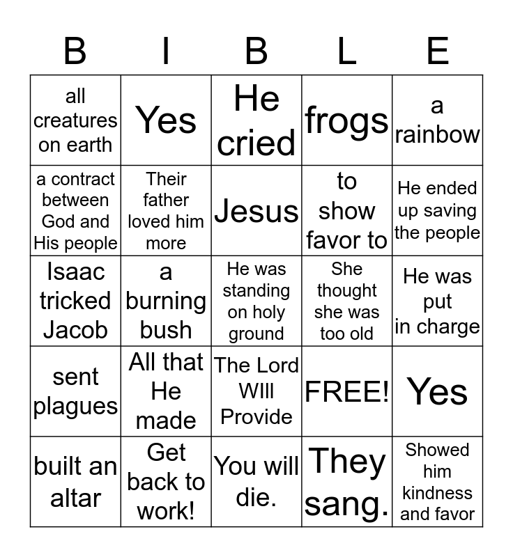This bingo card has 25 words: All that He made, You will die., Jesus, built an altar, a rainbow, all creatures on earth, a contract between God and His people, Yes, She thought she was too old, The Lord WIll Provide, to show favor to, Isaac tricked Jacob, FREE!, Yes, Their father loved him more, Showed him kindness and favor, He was put in charge, He cried, He ended up saving the people, a burning bush, He was standing on holy ground, Get back to work!, sent plagues, frogs and They sang..