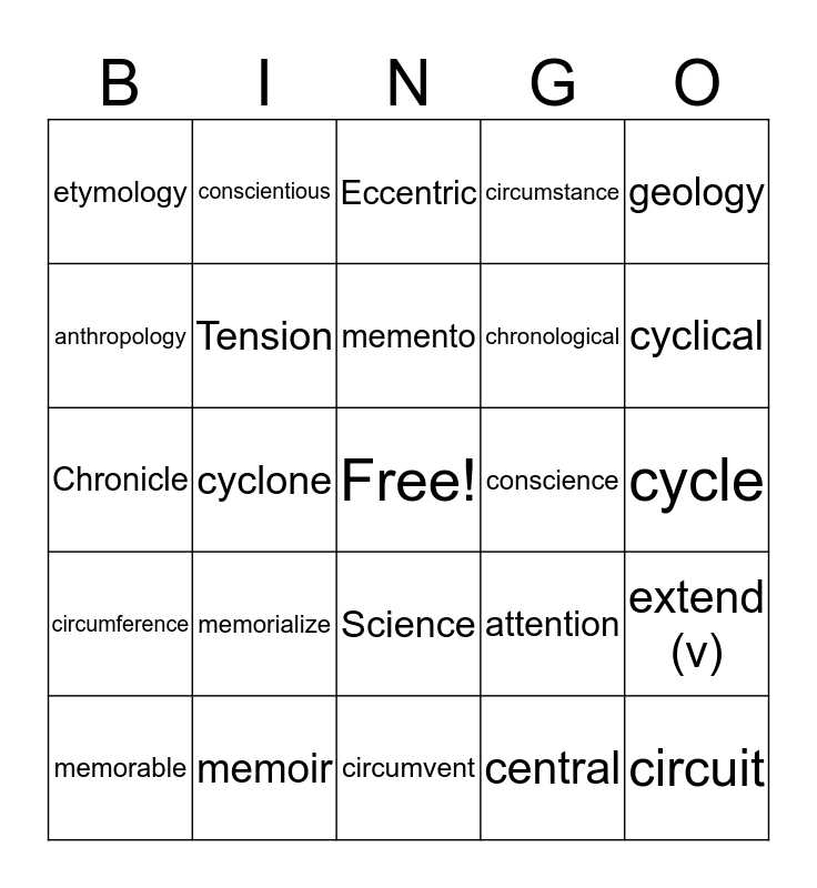 This bingo card has a free space and 24 words: memorialize, memoir, memento, memorable, geology, etymology, anthropology, conscientious, conscience, Science, chronological, Chronicle, attention, extend (v), Tension, central, cycle, Eccentric, cyclical, cyclone, circuit, circumference, circumstance and circumvent.