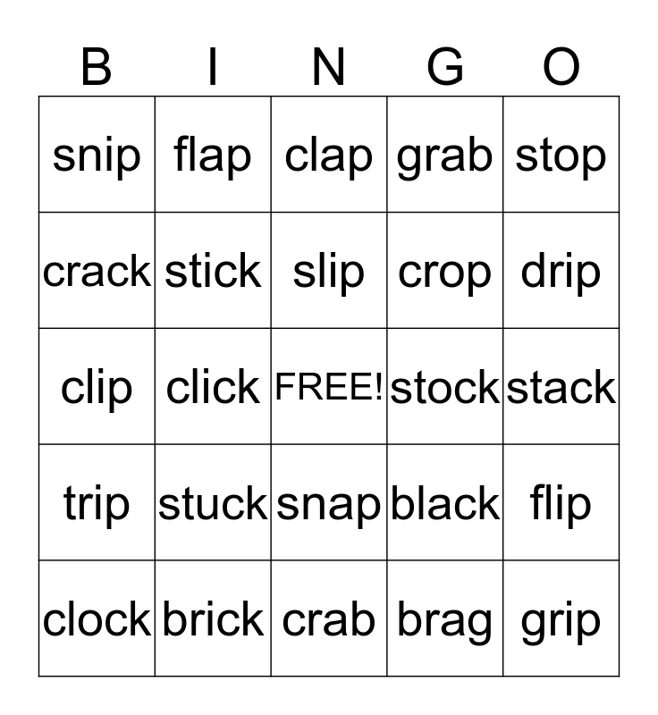 This bingo card has a free space and 24 words: stuck, brick, slip, clock, stop, snip, crack, flap, stock, snap, crop, clip, black, flip, stick, brag, stack, clap, drip, click, grip, trip, grab and crab.