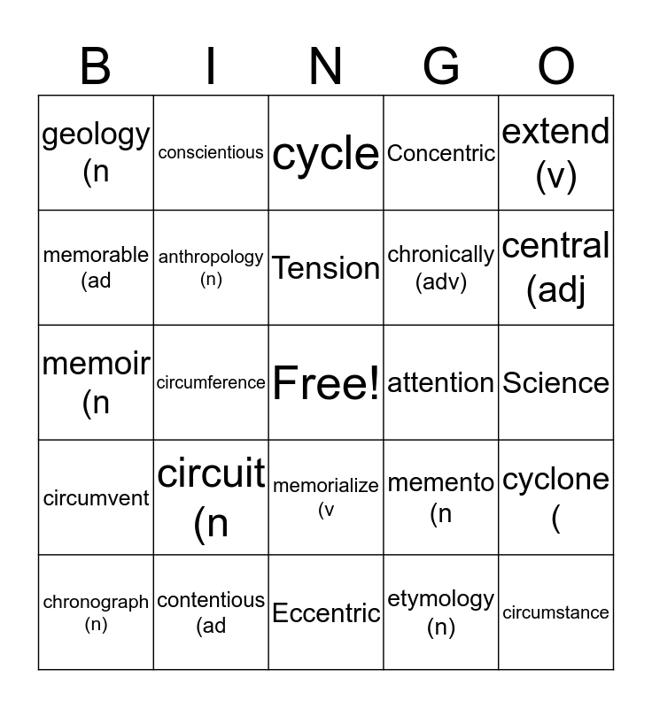 This bingo card has a free space and 24 words: circuit (n, contentious (ad, Tension, chronograph (n), extend (v), geology (n, memorable (ad, conscientious, attention, memorialize (v, chronically (adv), memoir (n, memento (n, cyclone (, anthropology (n), etymology (n), Science, cycle, central (adj, circumference, circumstance, circumvent, Concentric and Eccentric.