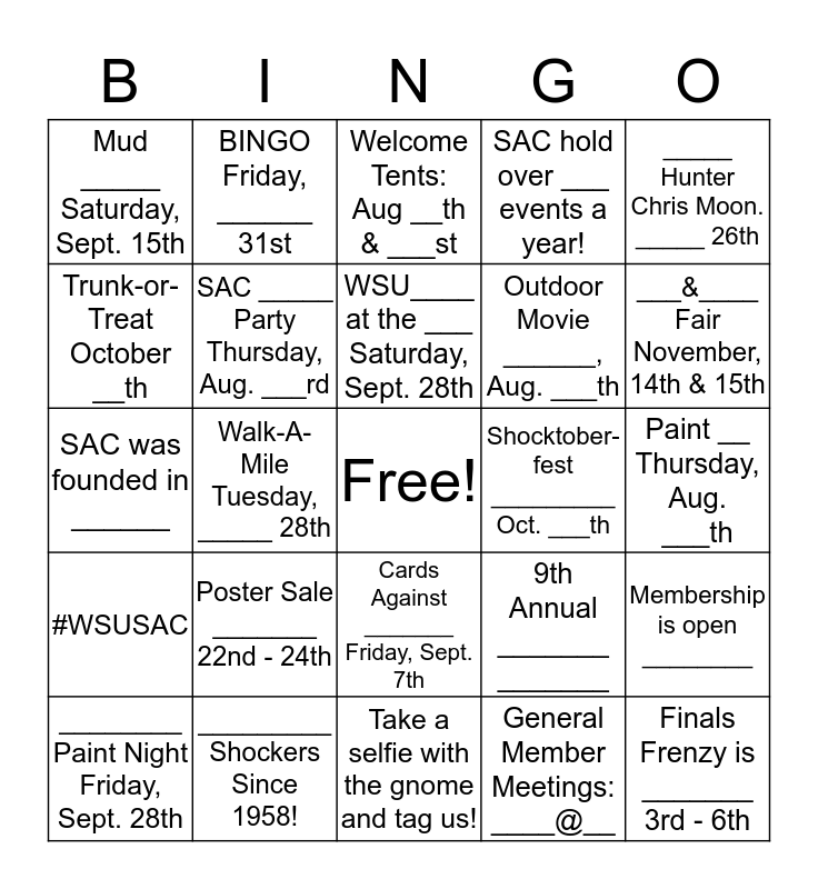 This bingo card has a free space and 24 words: Poster Sale _______ 22nd - 24th, _________ Shockers Since 1958!, WSU____ at the ___ Saturday, Sept. 28th, ________ Paint Night Friday, Sept. 28th, _____ Hunter Chris Moon. _____ 26th, Mud _____ Saturday, Sept. 15th, Trunk-or-Treat October __th, BINGO Friday, ______ 31st, Shocktober-fest _________ Oct. ___th, Cards Against _______ Friday, Sept. 7th, Outdoor Movie ______, Aug. ___th, SAC was founded in ______, 9th Annual _______ _______, Membership is open ________, SAC _____ Party Thursday, Aug. ___rd, General Member Meetings: ____@__, Paint __ Thursday, Aug. ___th, Welcome Tents: Aug __th & ___st, ___&____ Fair November, 14th & 15th, Walk-A-Mile Tuesday, _____ 28th, Finals Frenzy is _______ 3rd - 6th, #WSUSAC, SAC hold over ___ events a year! and Take a selfie with the gnome and tag us!.