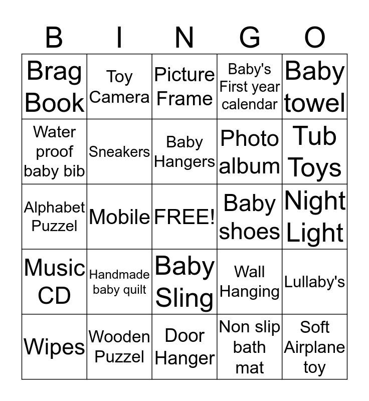 This bingo card has a free space and 24 words: Handmade baby quilt, Wooden Puzzel, Baby Hangers, Wipes, Baby towel, Brag Book, Water proof baby bib, Toy Camera, Baby shoes, Baby Sling, Photo album, Alphabet Puzzel, Wall Hanging, Lullaby's, Sneakers, Non slip bath mat, Night Light, Picture Frame, Tub Toys, Mobile, Soft Airplane toy, Music CD, Baby's First year calendar and Door Hanger.