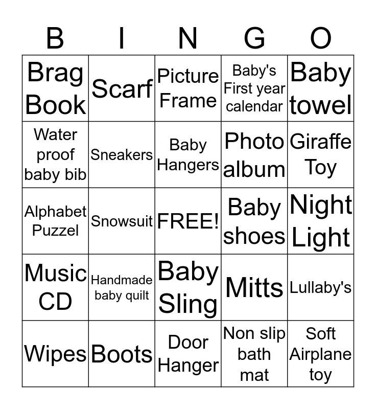 This bingo card has a free space and 24 words: Handmade baby quilt, Boots, Baby Hangers, Wipes, Baby towel, Brag Book, Water proof baby bib, Scarf, Baby shoes, Baby Sling, Photo album, Alphabet Puzzel, Mitts, Lullaby's, Sneakers, Non slip bath mat, Night Light, Picture Frame, Giraffe Toy, Snowsuit, Soft Airplane toy, Music CD, Baby's First year calendar and Door Hanger.