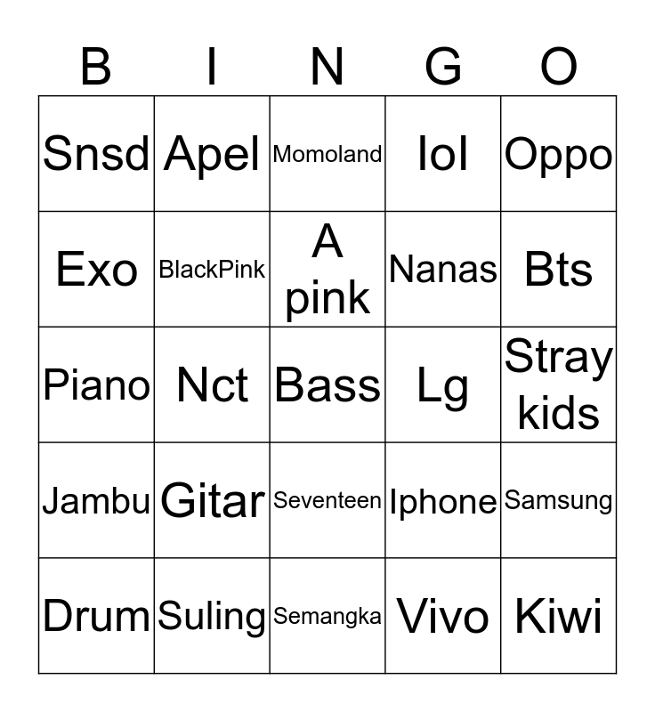 This bingo card has 25 words: Jambu, Suling, Bass, Vivo, Oppo, Snsd, Apel, Momoland, Lg, Samsung, Exo, BlackPink, Semangka, Iphone, Bts, Drum, Nct, A pink, Nanas, Stray kids, Piano, Gitar, Seventeen, IoI and Kiwi.