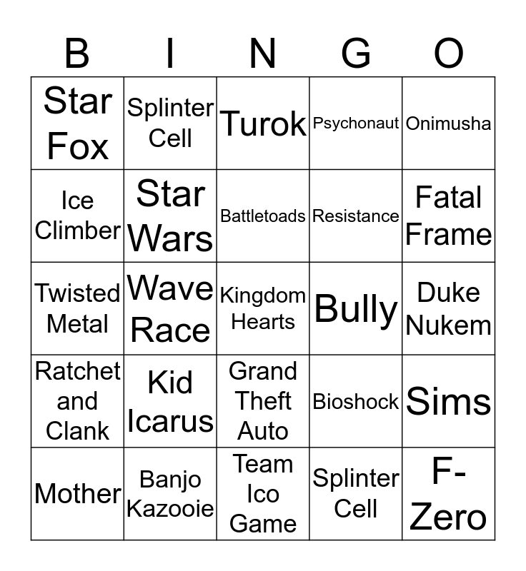 This bingo card has a free space and 24 words: Kid Icarus, Banjo Kazooie, Battletoads, Mother, Onimusha, Star Fox, Ice Climber, Splinter Cell, Bully, Grand Theft Auto, Resistance, Twisted Metal, Bioshock, Sims, Star Wars, Splinter Cell, Duke Nukem, Turok, Fatal Frame, Wave Race, F-Zero, Ratchet and Clank, Psychonaut and Team Ico Game.